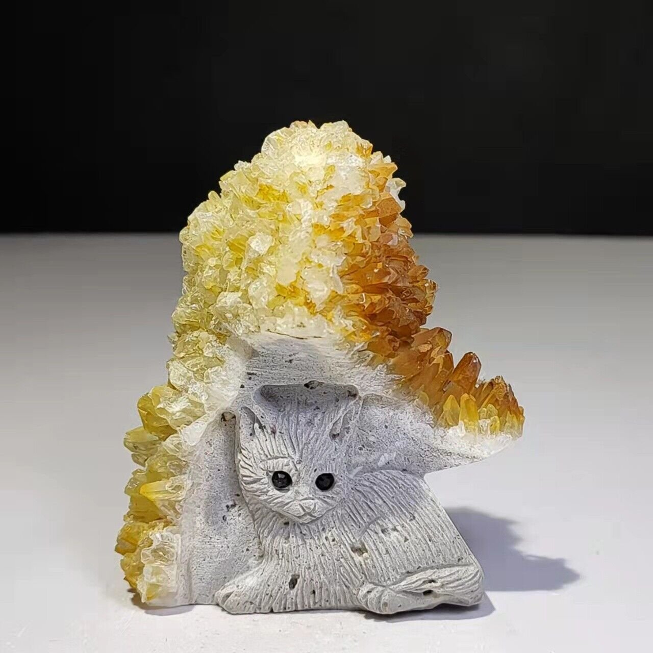 Natural crystal cluster, quartz mineral specimen, hand carving, cat