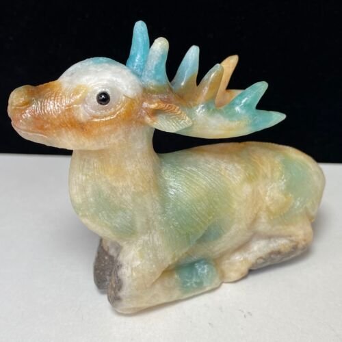 Precious Amazonite Deer with Geodic Quartz Crystals, 85mm Tall, 238g (Yellow, Blue, Green)