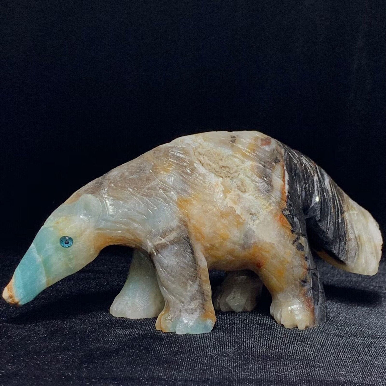Stunning Amazonite Anteater with Geodic Quartz Crystals, 74mm Tall, 442g (Blue, Gree, White, Black, Brown)