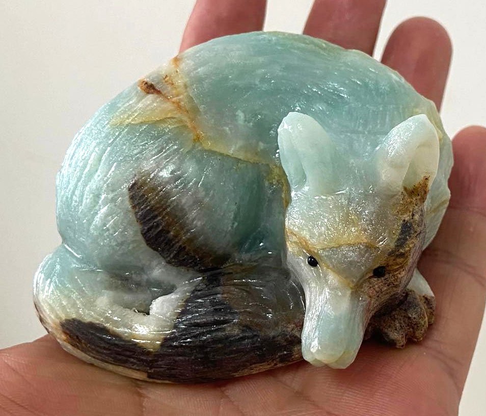 Stunning Amazonite Resting Fox or Wolf with Geodic Quartz Crystals, 40mm Tall, 288g (Blue, Brown, Red)
