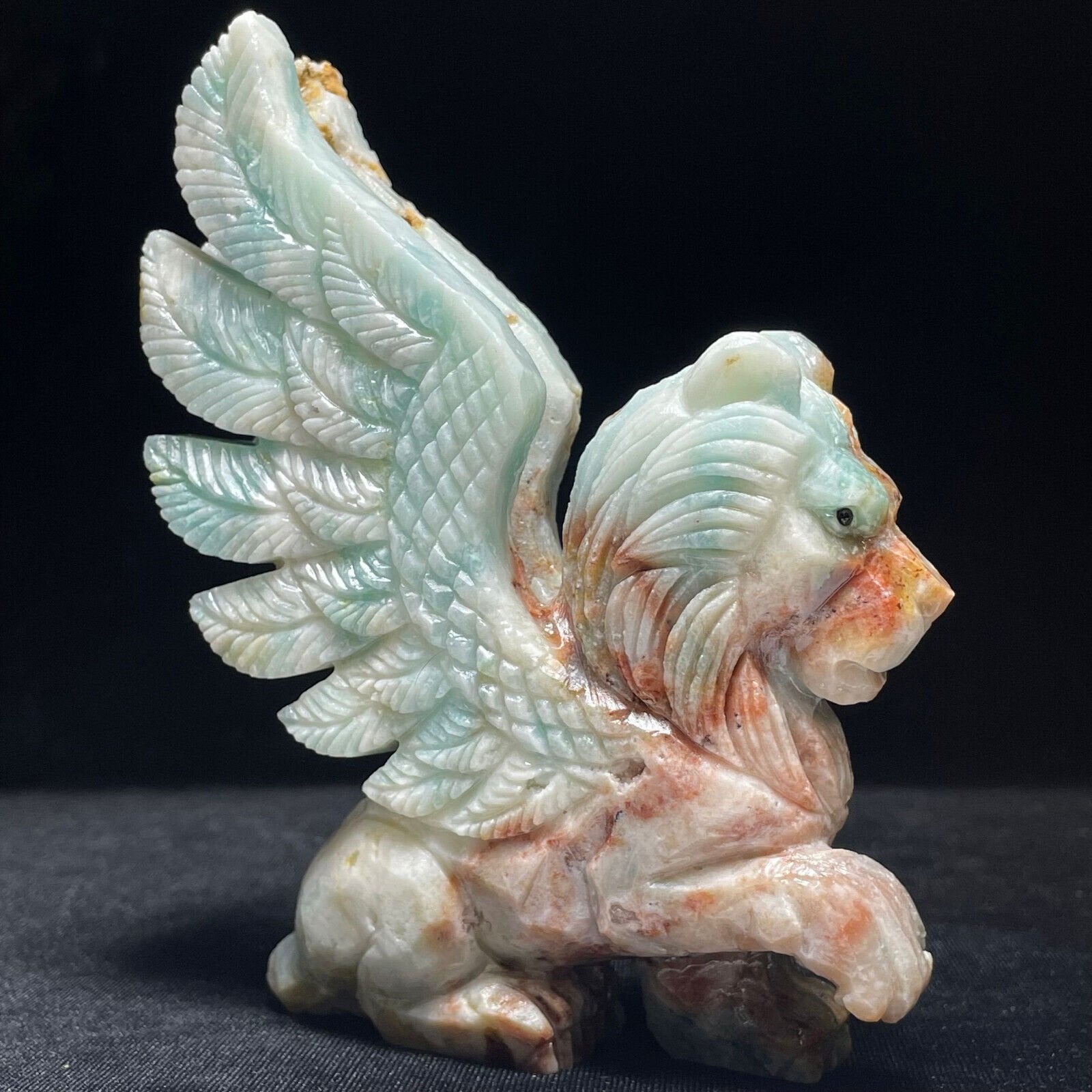 Stunning Amazonite Winged Lion with Geodic Quartz Crystals, 113mm Tall, 376g (Blue, Red, Pink, Green)